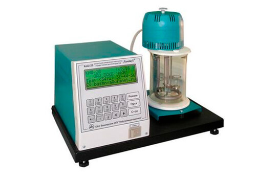 Определение температуры размягчения битумов в диапазоне от 30 до 157°C в аппарате методом КиШ. КиШ — метод определения температуры размягчения нефтяных битумов по кольцу и шару. Сущность метода заключается в определении температуры, при которой битум, находящийся в кольце заданных размеров, в условиях испытания размягчается и перемещается под действием стального шарика, нижней пластинки. Как среда используется дистиллированная вода (30...80°C), глицерин (80...157°C) или этиленгликоль (30...110°C).